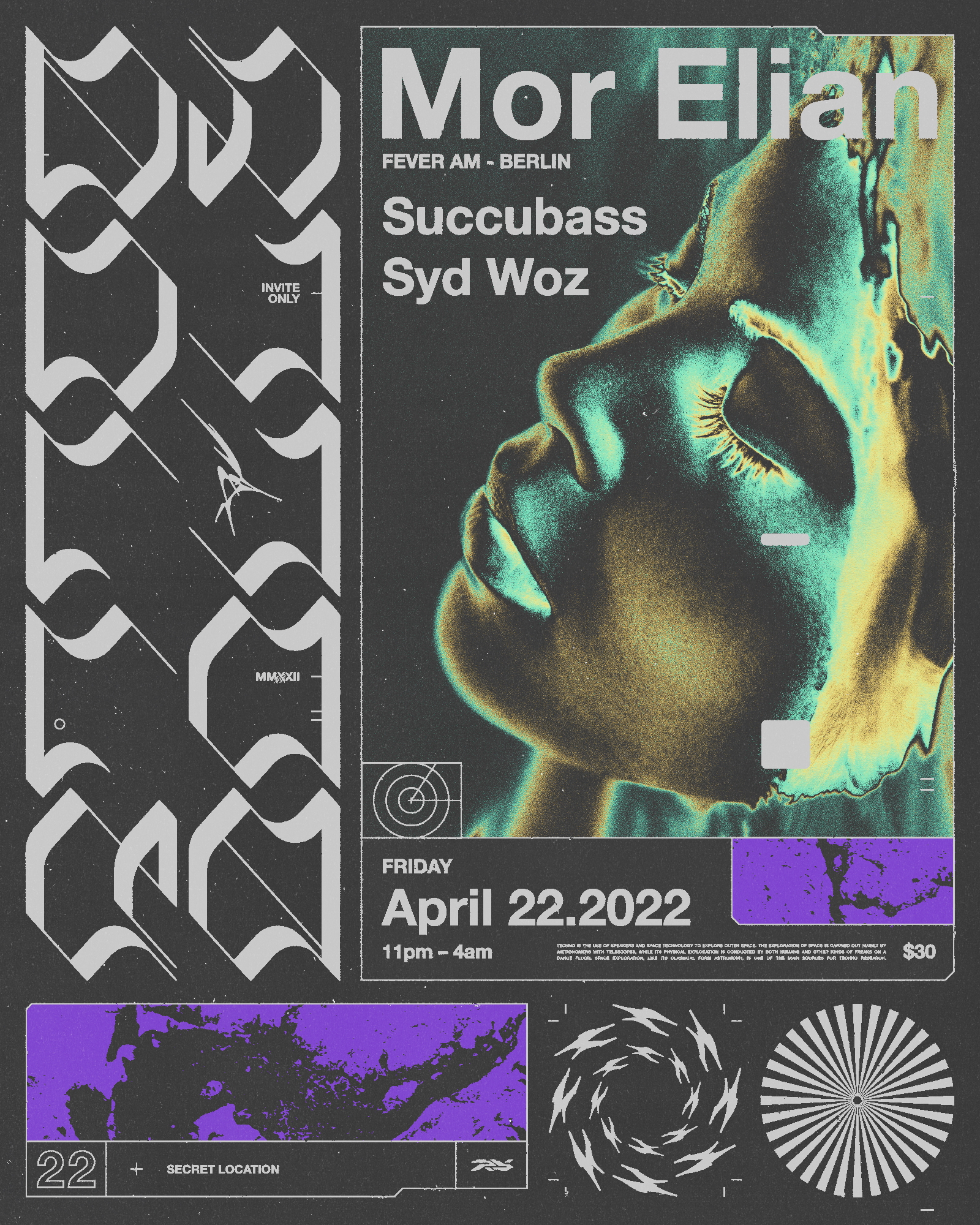 Mor Elian is a producer of unconventional, spacey electro-techno, with releases on Hypercolour, Radio Matrix, Delft, and Fever AM (the label she co-founded with Rhyw from Cassegrain). Raised on techno and drum & bass in the vibrant rave scene of Tel Aviv, she developed a futuristic hybrid club sound, merging elements of electro, UK garage, techno, and house with an ear for complex drum programming. Now splitting her time between Berlin and Los Angeles, she stays busy between releases by booking underground dance events and DJing around the world.
