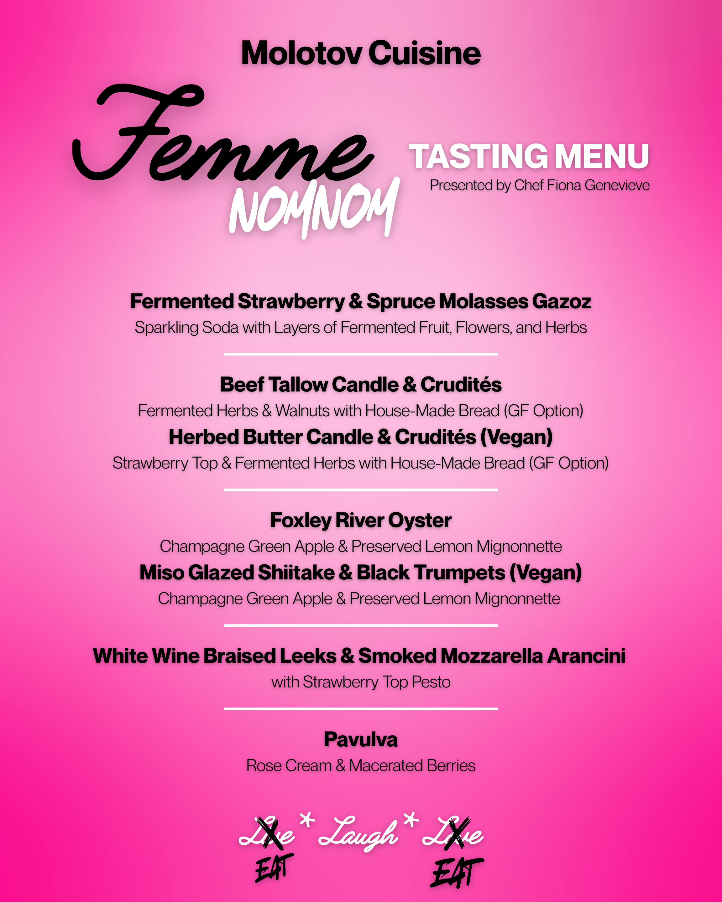 MENU DROP!!! Prepare your taste buds, Montreal! Chef Fiona Genevieve of Molotov Cuisine has unveiled the extraordinary five-course tasting menu for FemmeNOMNOM, a culinary journey celebrating femme power in all its diverse expressions. Feast on innovative dishes like Fermented Strawberry & Spruce Molasses Gazoz, White Wine Braised Leeks & Smoked Mozzarella Arancini, and Foxley River Oysters!