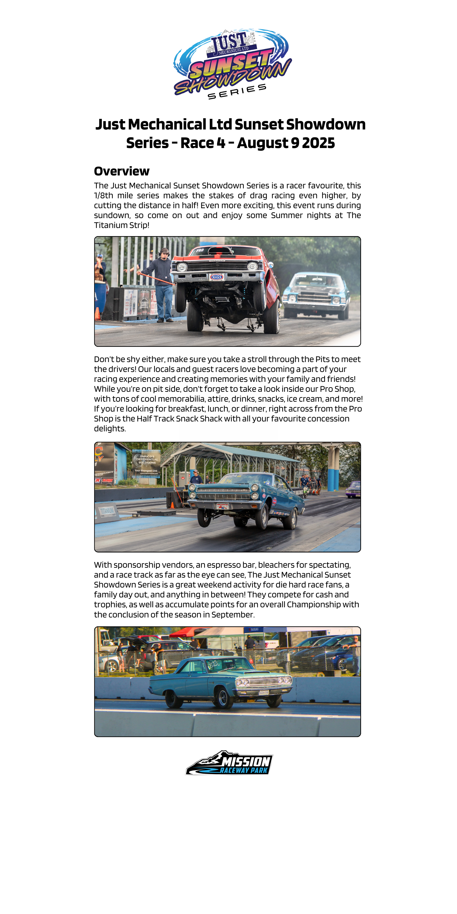 REFUNDS: Refunds are made at the discretion of MRP Managment. RAIN CHEQUES: Entry fee will be rain chequed only if NO runs were made. Please see gate staff or email us at info@missionraceway.com for more information.
