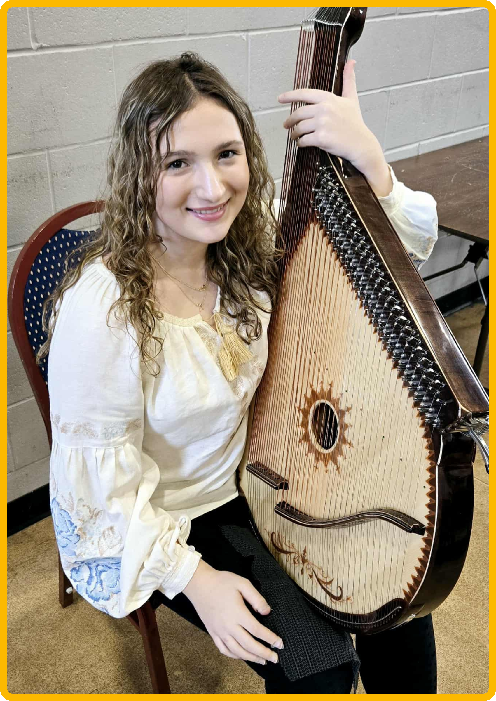 Solomia Shevchuk, a young rising artist, has been playing bandura for 11 years, beginning her musical journey at the age of five. She studies under the guidance of her teacher, Oksana Zelinska-Shevchuk, an experienced bandura instructor, whose mentorship has helped shape her growth as a dedicated and expressive performer. Throughout her musical development, Solomia has participated in numerous competitions and festivals, earning recognition for her skill, achievements and commitment. Annually, she has competed successfully in the Kiwanis Music Festival and the Ukrainian Festival in Toronto, where her performances have been recognized with Platinum awards and top scholarships. With many years of experience and a strong passion for music, Solomia continues to refine her artistry and share her talent with her community.
