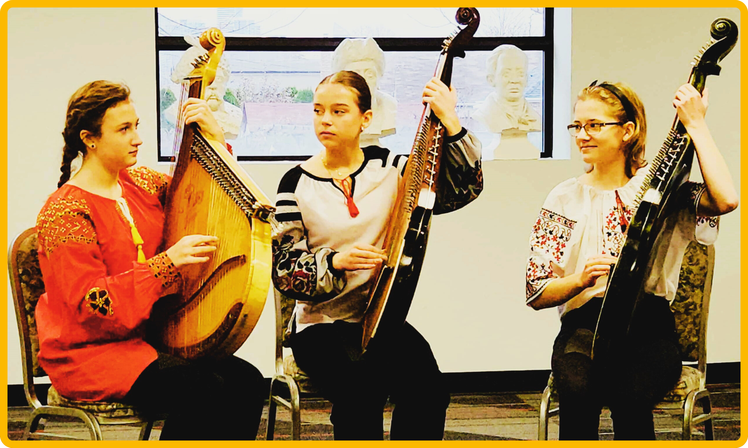 Representing Vira Zelinska Bandura Capella “Zoloti Struny”, the Bandura Trio consists of young, talented bandurists Solomia Kosarenko, Solomia Shevchuk, and Daria Sulipka. In addition to playing as part of Zoloti Struny, the girls perform regularly as soloists and in duets, trios, and quartets. As a trio and individually, they are Platinum Award winners at the Toronto Kiwanis Music Festival and prizewinners at the Marta Krawciw-Barabash Ukrainian Music Festival in Toronto. The Trio is skilled in both instrumental and vocal music, performing a variety of genres and styles from classical to modern popular songs.