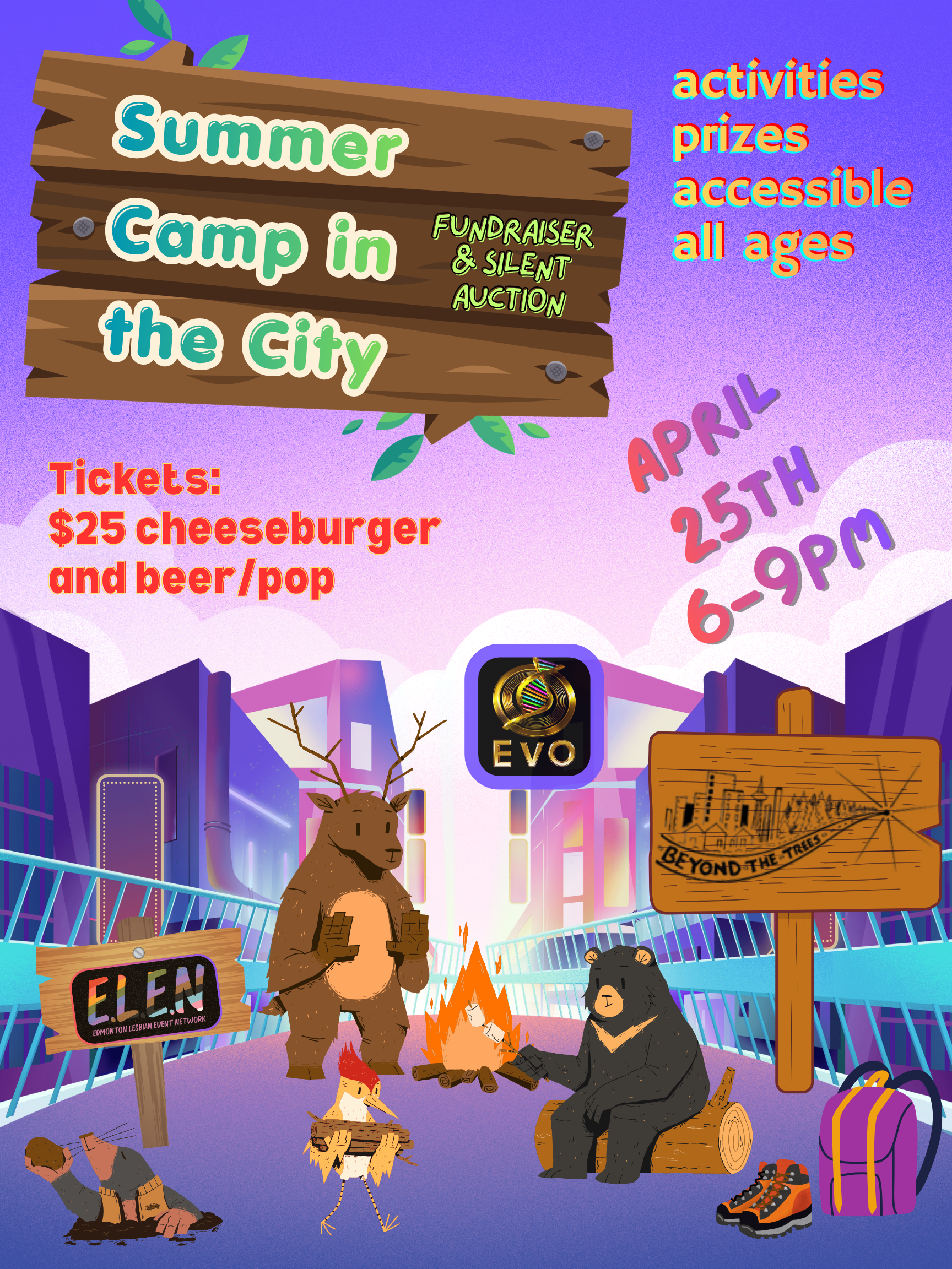 ELEN can't wait to host another fundraiser for Beyond The Trees: Alberta's Inclusive Overnight Outdoor Youth Camp! We are so pleased to be collabing with Evo to offer dinner service for this one. This all ages event will welcome youth, parents, siblings, families, volunteers and supporters of all the amazing programming BTT has to offer. While raising money for a good cause, you get an awesome burger meal deal and the opportunity to play cute campy games that re-create a summer experience. Fill out your camp Passport by participating to receive a prize.