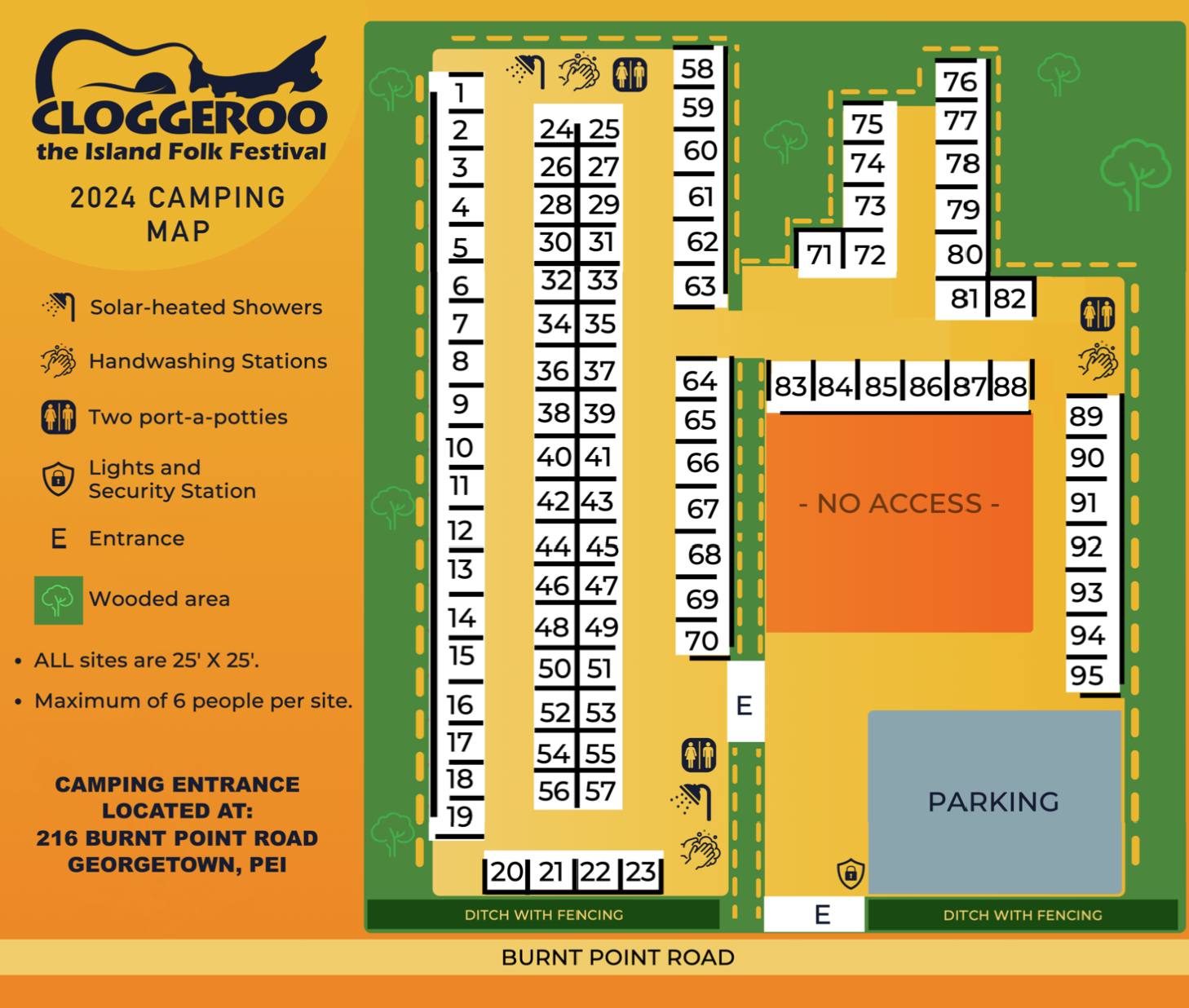 No refunds. No pets. You MUST have a festival ticket to be able to register for the campground. Camping tickets without a corresponding festival ticket will not be honoured. No fires in the campground. If you have more than 6 people staying on a site you will be asked to purchase additional sites. Cloggeroo the Island Folk Festival reserves the right to remove anyone seen as a threat to the health and safety of other festival goers from the campground. This is a rain or shine event.