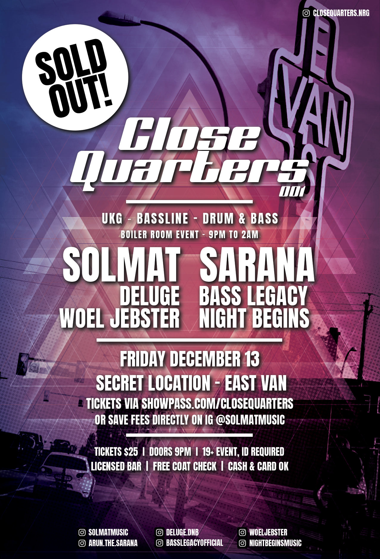 Welcome to the debut of CLOSE QUARTERS - a brand new rotating-genre series of intimate (125 capacity) boiler room events at a secret location in East Vancouver (7 min from Main Street Skytrain)!