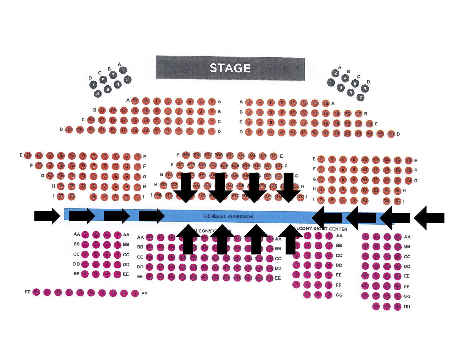 * General Admission seating consists of folding chairs on the Floor level, behind the reserved seating and under the balcony overhang. There will also be a small amount of General Admission seats on the Balcony level. To purchase, click the narrow rectangle labeled "GENERAL ADMISSION" on the seat map. These seats are available on a first come, first served basis.