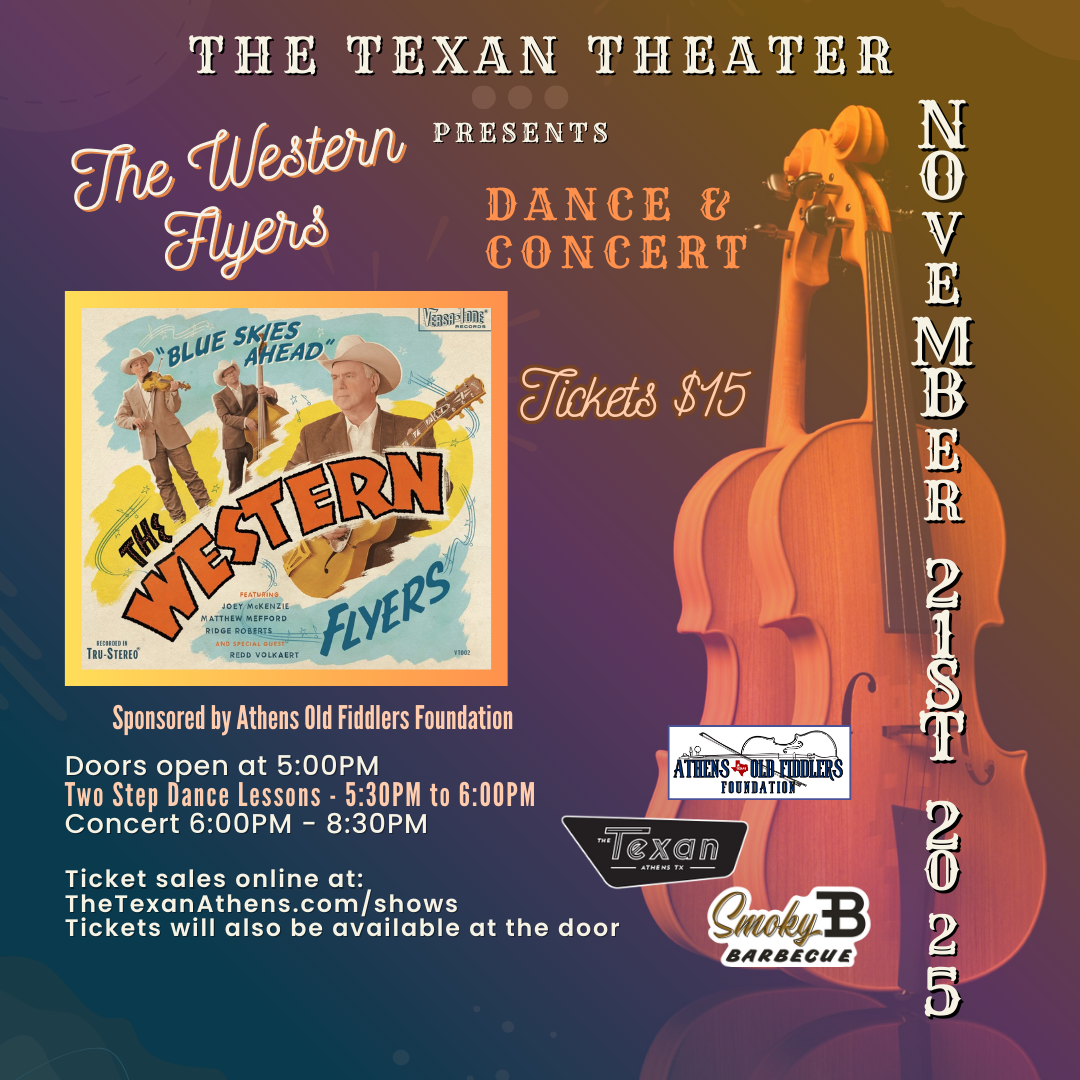 Sponsored by the Athens Old Fiddlers Foundation, The Western Flyers will perform on Friday, November 21st at The Texan in Athens! Doors will open at 5:00pm, and the band plays from 6:00-8:30pm. Smoky B Barbecue and Bar will be open beginning at 5pm. Tickets can be purchased online with credit card, and if the show does not sell out, tickets will be available at the door with payment by cash or card.