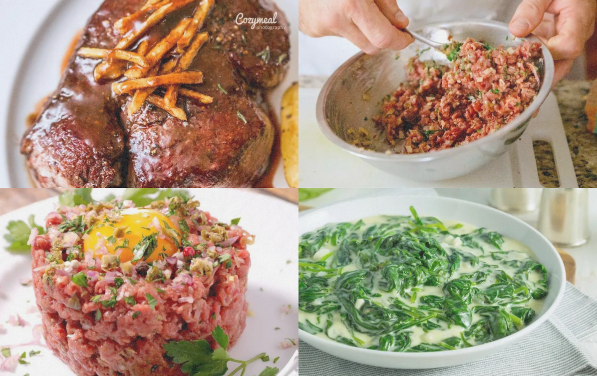 Start by making Dijon-highlighted steak tartare with tangy pickles, followed by mastering the art of cooking steak to perfection in a red wine and bone marrow sauce. Complement your main course with roasted wild mushrooms and rich creamed spinach as delectable sides.