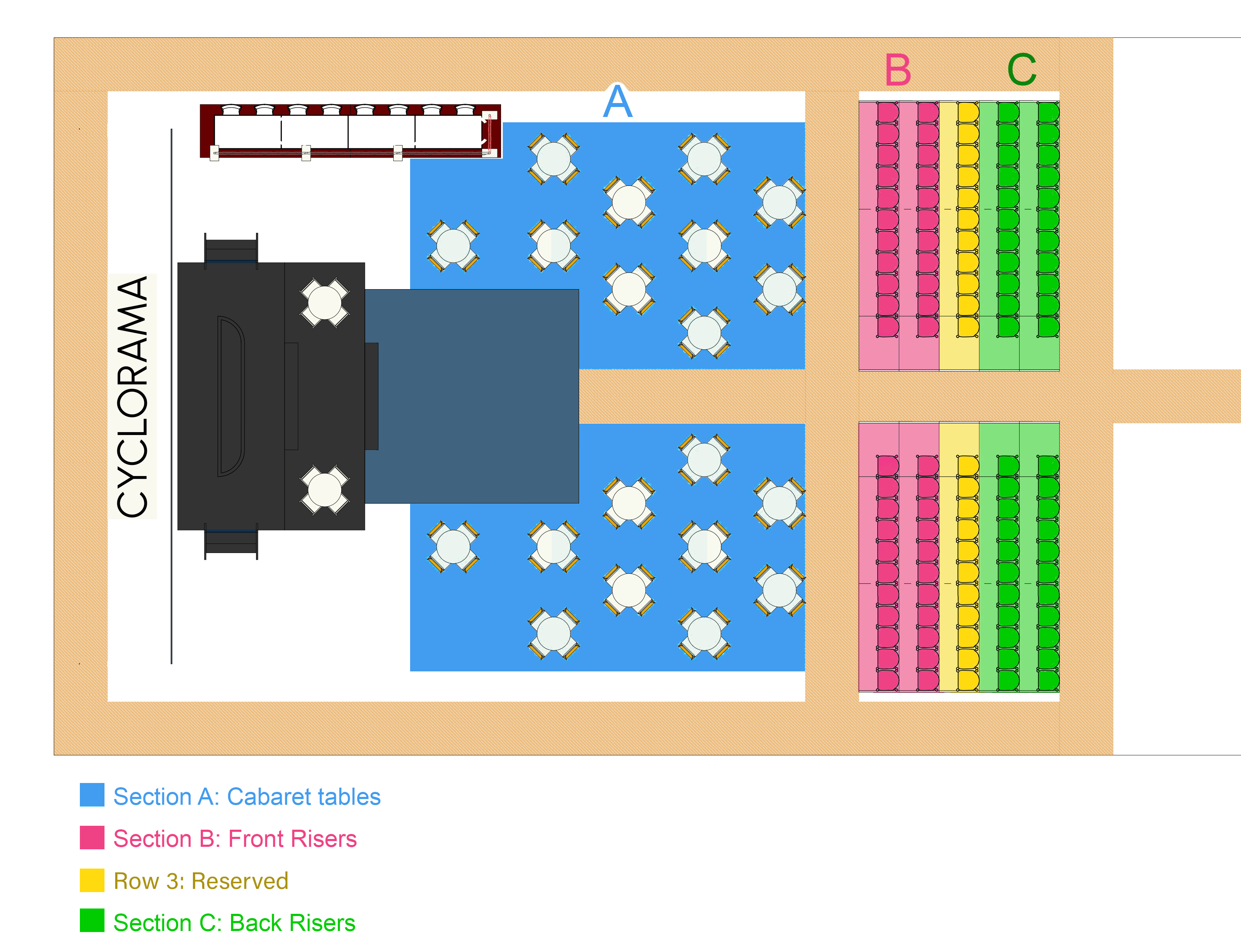 Cabaret tables seat 4. Cabaret seating is available as single tickets or as a 4-ticket package with 4 drink tickets included.