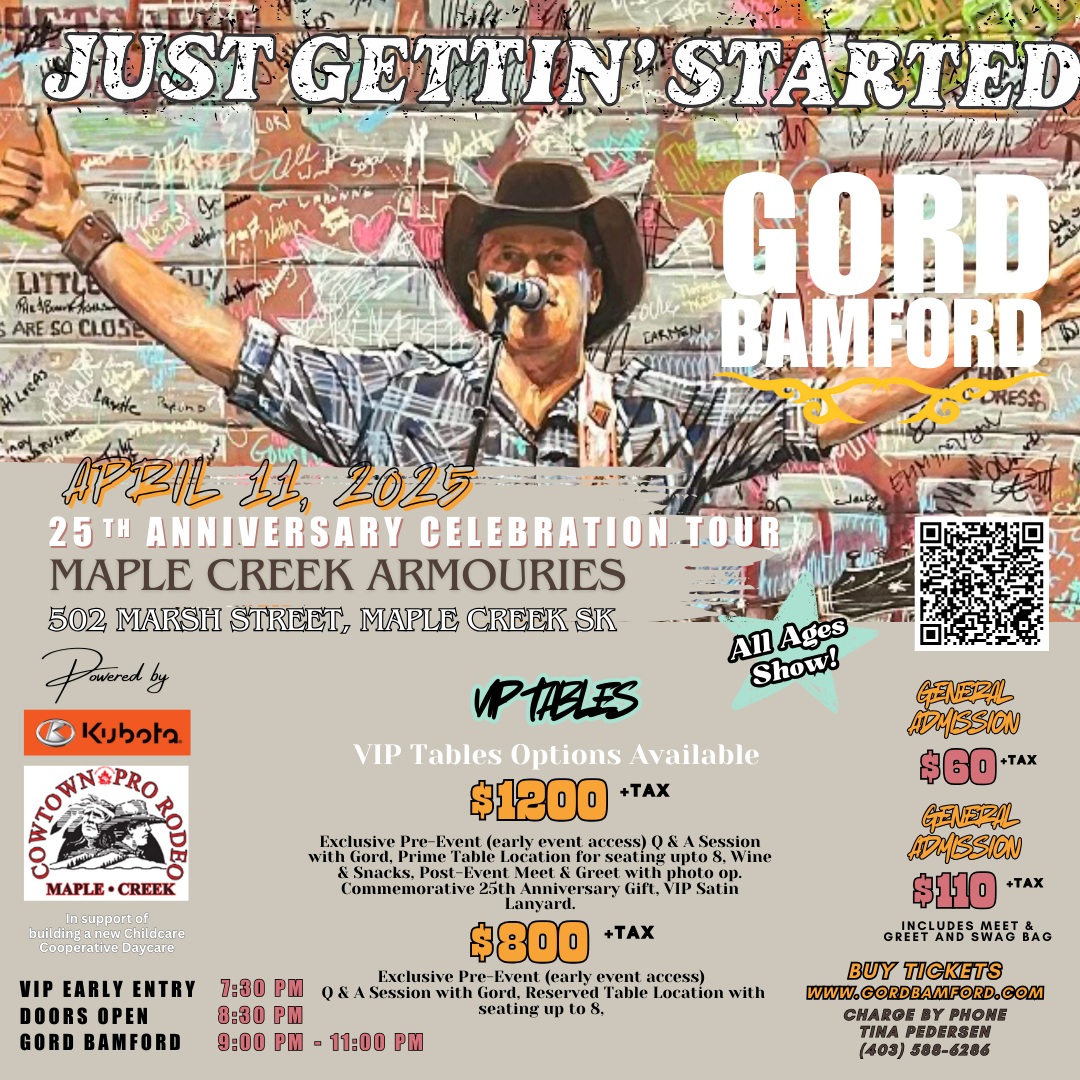 “Get ready for an unforgettable night of music and celebration! Gord Bamford, Canada’s most Awarded Male Country Music Artist, is hitting the road for his 25th Anniversary Just Gettin’ Started Celebration Tour!