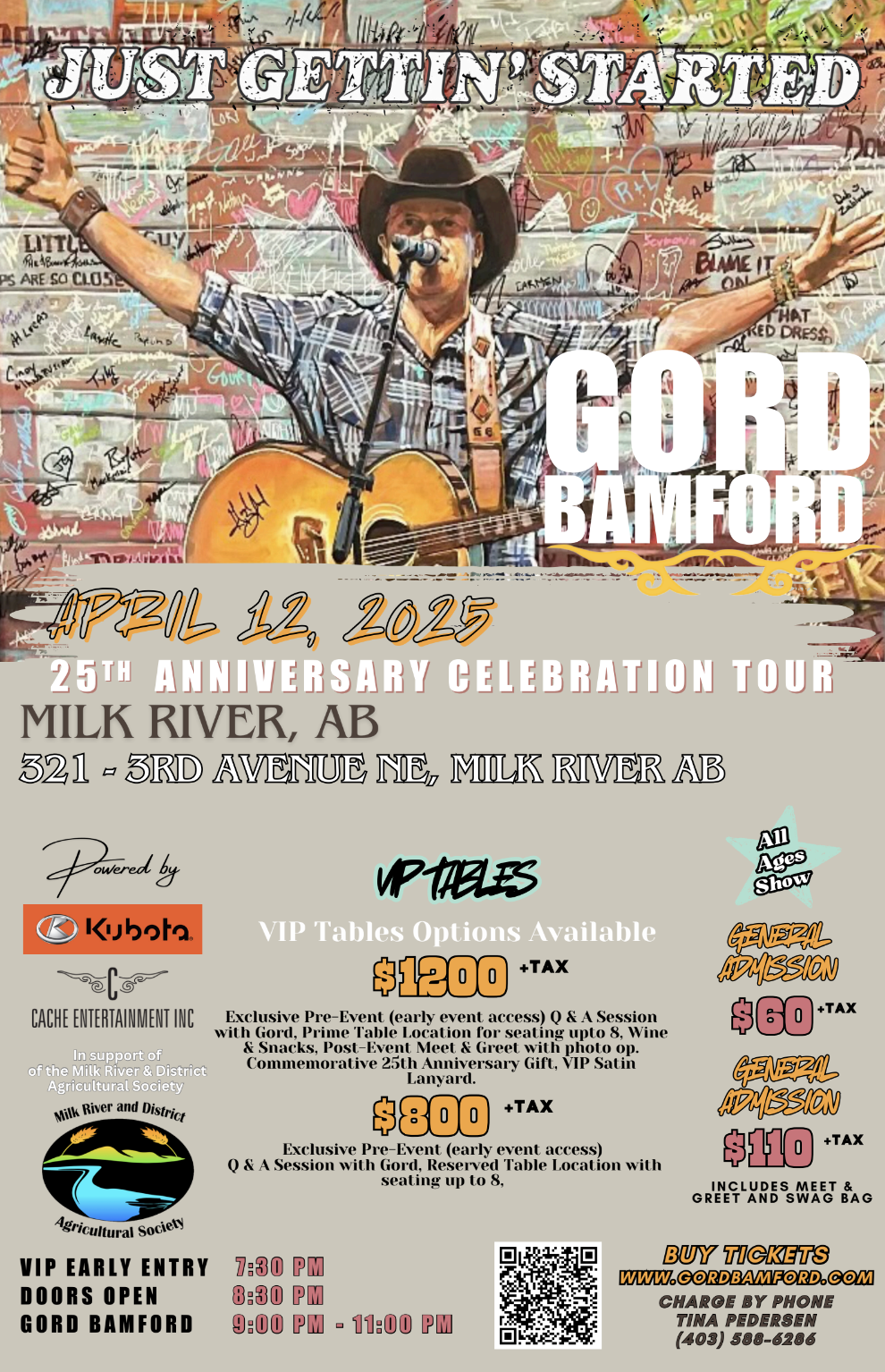 “Get ready for an unforgettable night of music and celebration! Gord Bamford, Canada’s most Awarded Male Country Music Artist, is hitting the road for his 25th Anniversary Just Gettin’ Started Celebration Tour!