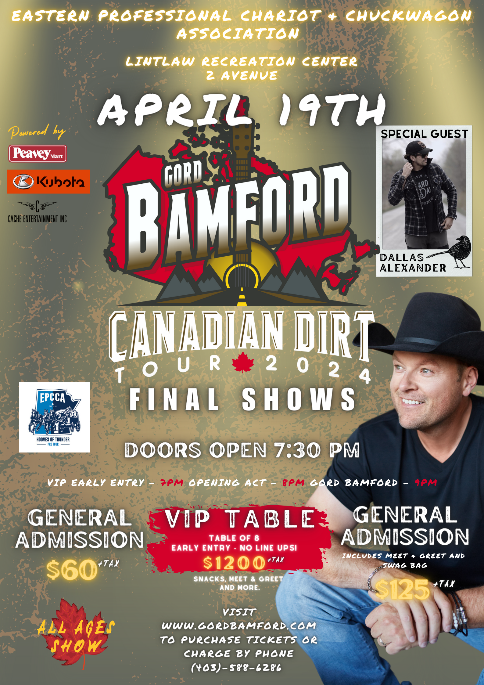 Come out and join us for the FINAL April shows with 26X CCMA AWARD-WINNING COUNTRY STAR GORD BAMFORD & THE 2024 CANADIAN DIRT TOUR.