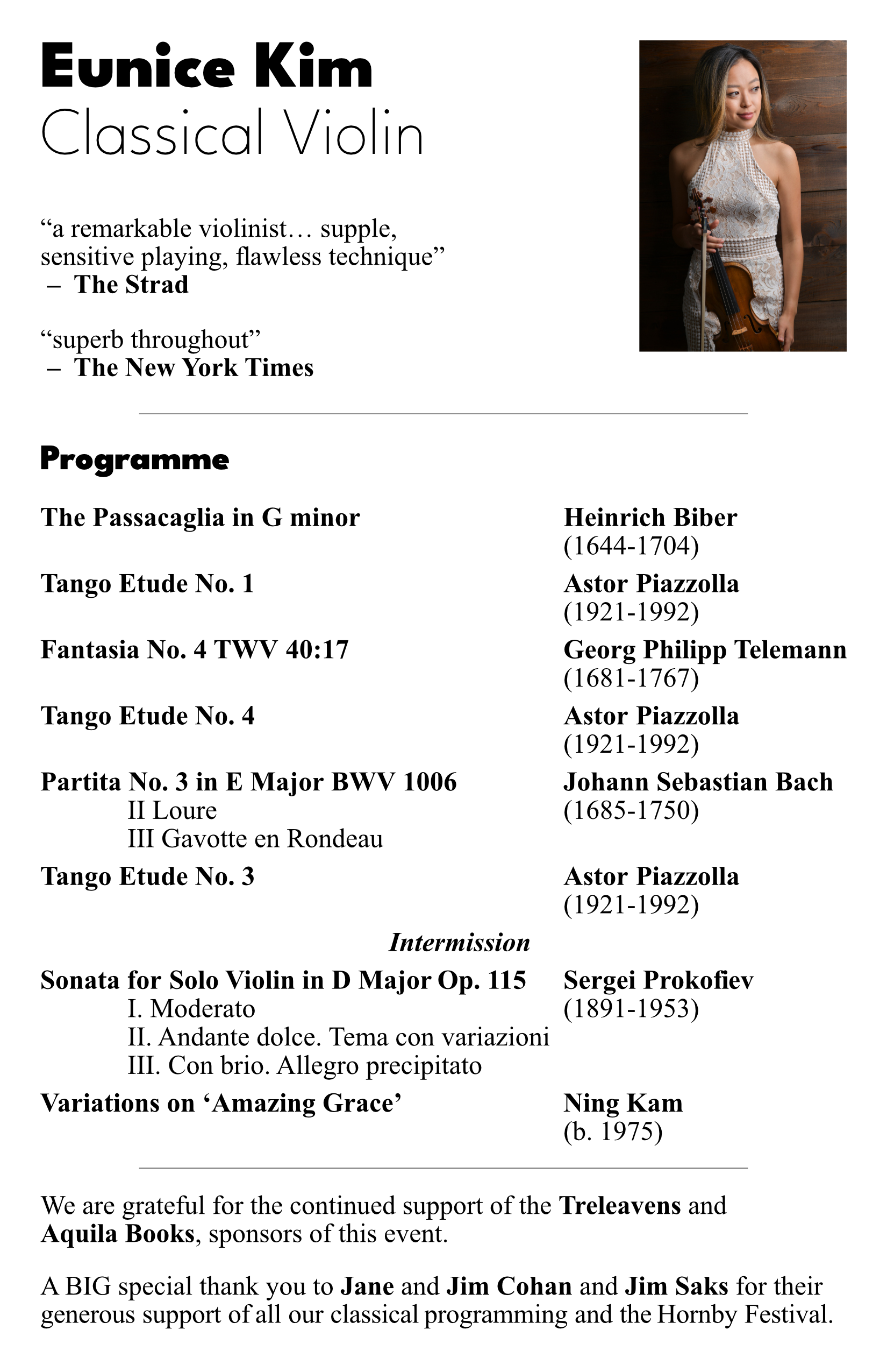 A young artist with a unique voice, violinist Eunice Kim has been proclaimed “just superb” by The New York Times and “a born performer” by Epoch Times. A native of the San Francisco Bay Area, the award-winning violinist has been a featured soloist with many orchestras. She recorded George Tsontakis’s Unforgettable, released in 2017 on Naxos Records, with the Albany Symphony Orchestra. Ms. Kim’s past performances include playing for the United Nations and Secretary General at Bohemian National Hall and the Henry Kissinger Prize Ceremony at the American Academy in Berlin. She was featured as a soloist at Carnegie’s Zankel Hall as a part of the Curtis Chamber Orchestra’s residency with Krzysztof Penderecki performing his Duo Concertante.