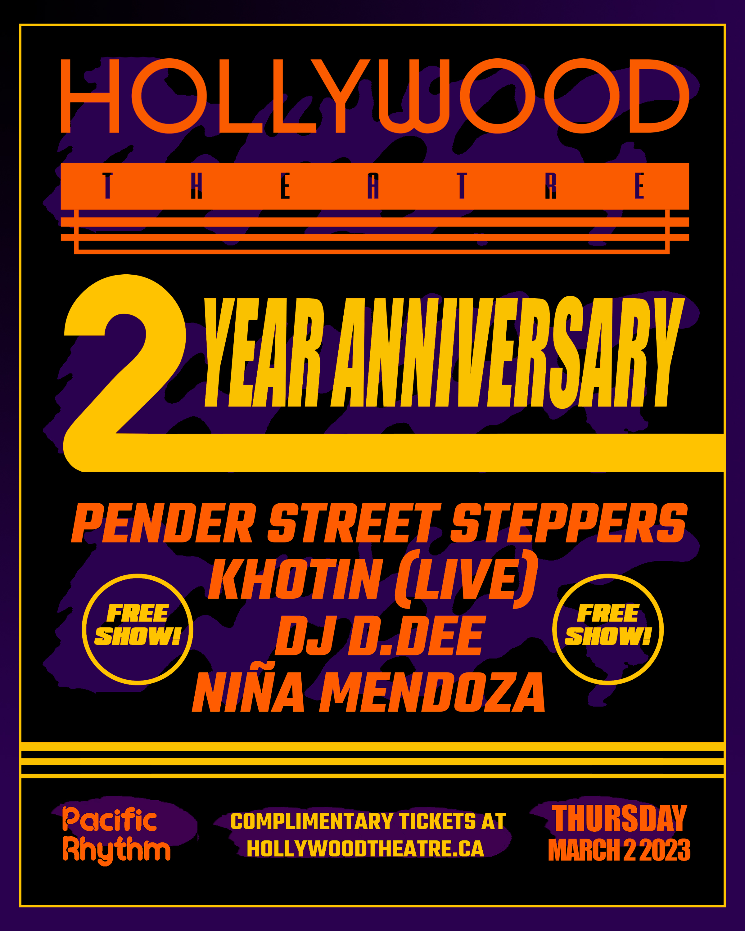 Refund Policy – Hollywood Theatre: All sales are final. Refunds are only issued if an event is cancelled or rescheduled. For cancellations, a full refund will be issued to the original payment method. For reschedules, tickets remain valid; if you can't attend, refund options will be shared by email. We cannot assist with third-party purchases. No refunds for missed shows, weather, or personal reasons. Questions? Email kristy@hollywoodtheatre.ca.