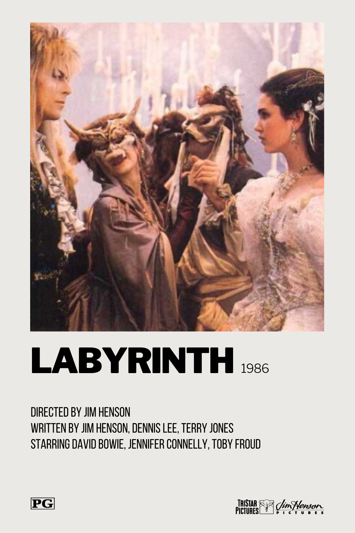 Labyrinth is a 1986 musical fantasy film directed by Jim Henson with George Lucas as executive producer. Based on conceptual designs by Brian Froud, the film was written by Terry Jones, and many of its characters are played by puppets produced by Jim Henson's Creature Shop. The film stars Jennifer Connelly as 16-year-old Sarah and David Bowie as Jareth, the Goblin King. In Labyrinth, Sarah embarks on a quest to reach the center of an enormous, otherworldly maze to rescue her infant half-brother Toby, whom she wished away to Jareth.