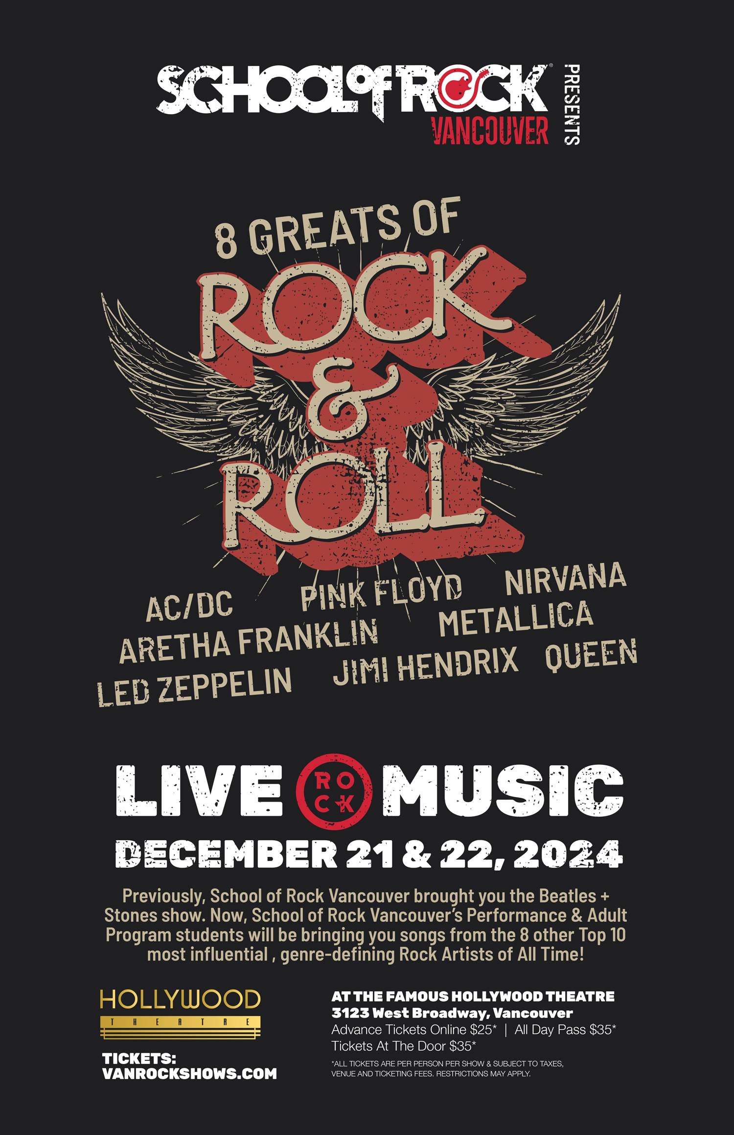 Previously, School of Rock Vancouver brought you the Beatles + Stones show. Now, School of Rock Vancouver’s Performance & Adult Program students will be bringing you songs from the 8 other Top 10 most influential , genre-defining Rock Artists of All Time! Students ranging from 7-18 years old from the Rock 101 and Performance programs as well as Adult programs will be performing songs from AC/DC, Pink Floyd, Nirvana, Aretha Franklin, Metallica, Led Zeppelin, Jimi Hendrix, and Queen! Dance along and cheer these kids (and adult kids) on as they have fun showing off what they’ve learnt in a few short months.