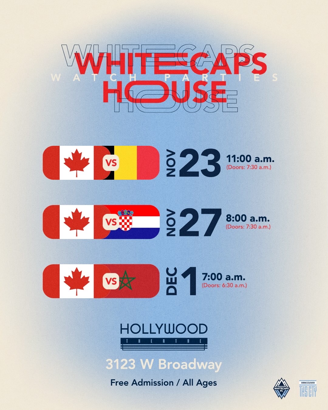 December 1st at 7am – Whitecaps House: Canada vs. Morocco (Doors: 6:30)