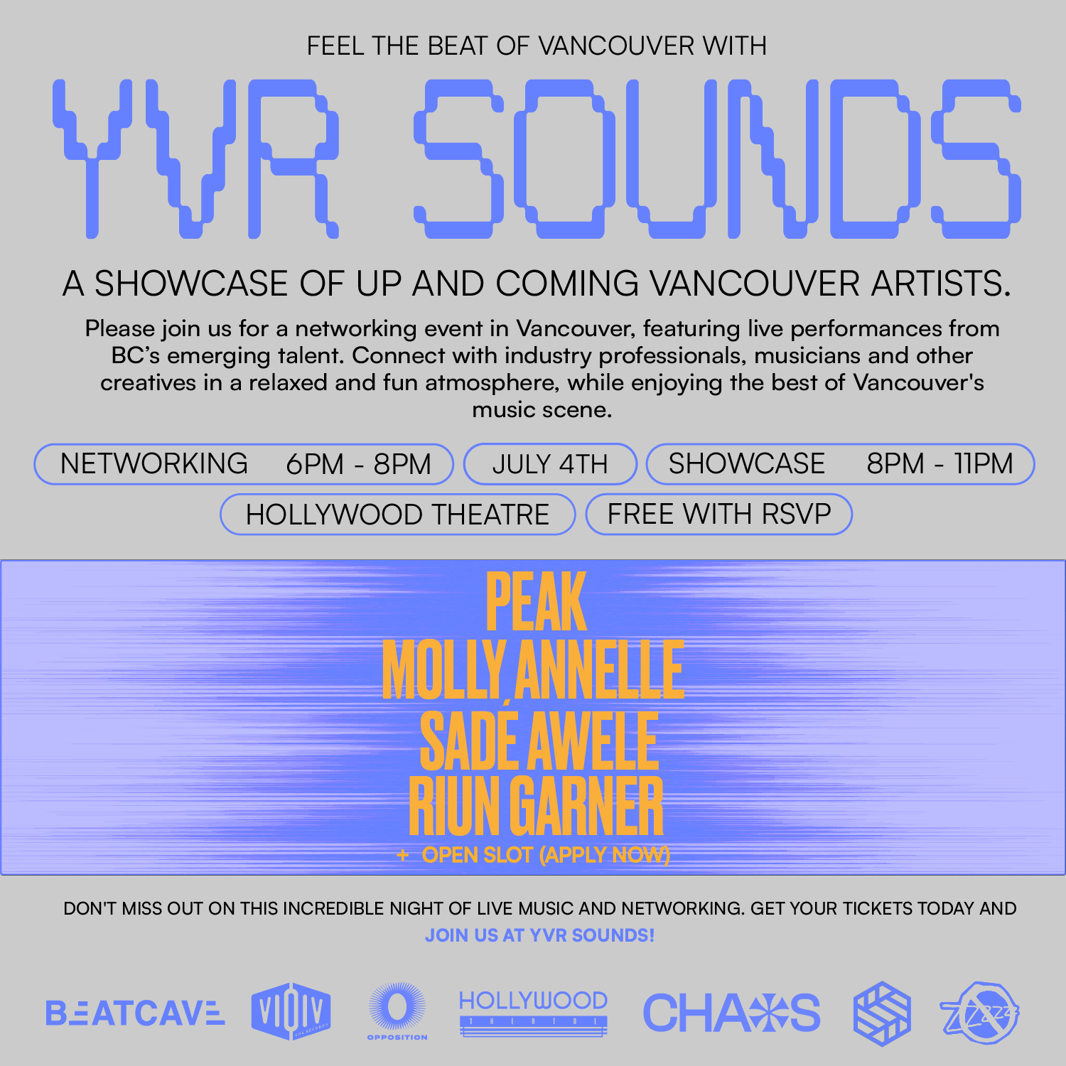 *The opening slot of YVR SOUNDS is being filled through a public submission link found below. We will be reviewing each submission and using this pool to book for future events. Fill out the form for your chance to perform at Hollywood Theatre on July 4th!