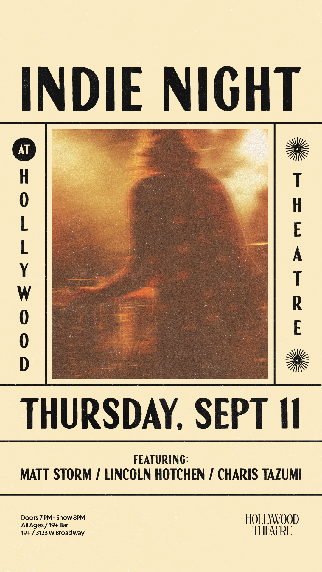 Join us at Hollywood Theatre for a night of indie soul, alt-pop, and raw storytelling from three rising Canadian artists. Featuring the atmospheric alt-soul of Matt Storm, the high-energy hooks of Lincolnhotchen, and the heartfelt sound of Charis Tazumi. Whether you're a longtime local music supporter or discovering new favourites, this is a night to lean in and listen.