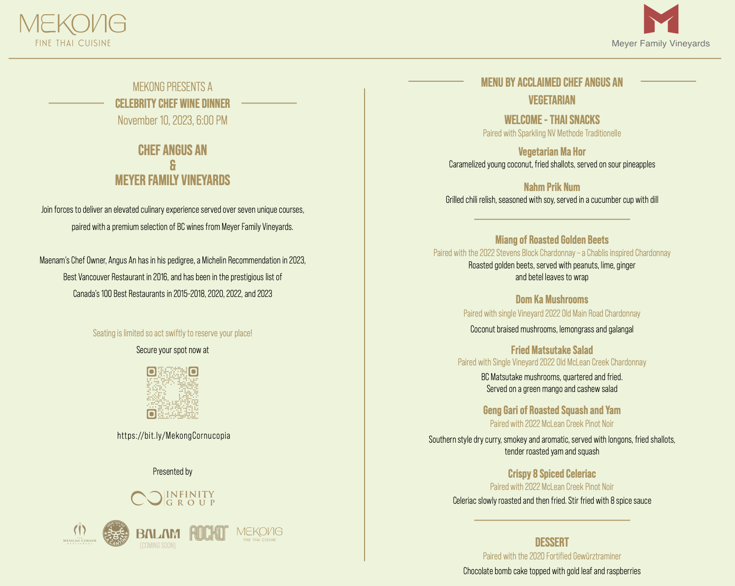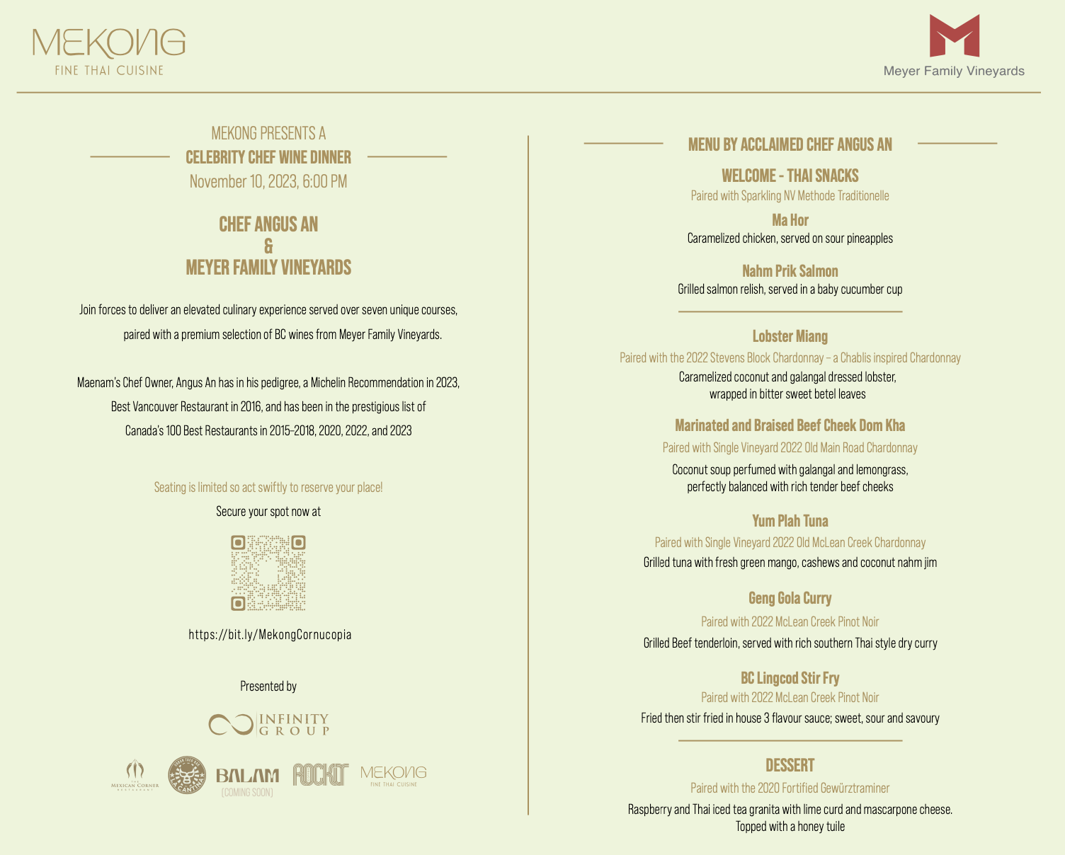 Mekong is Whistler’s newest restaurant and will present their first Cornucopia wine dinner on November 10, 2023. Culinary Director, Chef Angus An of Vancouver’s Michelin-recommended restaurant Maenam will be cooking alongside Mekong’s Head Chef Bonnie Khummuang.