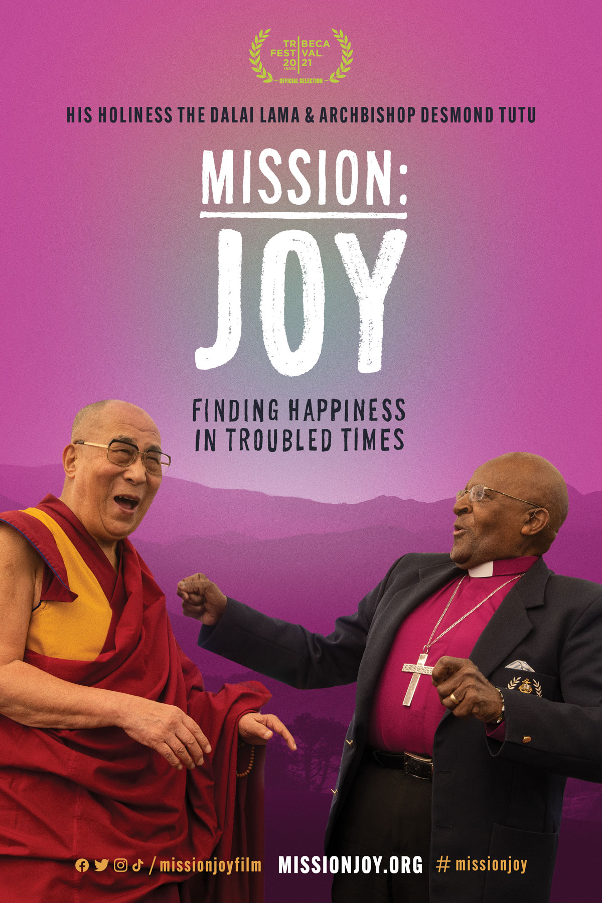 MISSION:JOY gives us unprecedented access to the unlikely friendship between two international icons who transcend religion: His Holiness the Dalai Lama & Archbishop Tutu. In their final joint mission, these self-described mischievous brothers give a master class in how to create joy in a world that was never easy for them. They offer neuroscience-backed wisdom to help each of us live with more joy, despite circumstances.