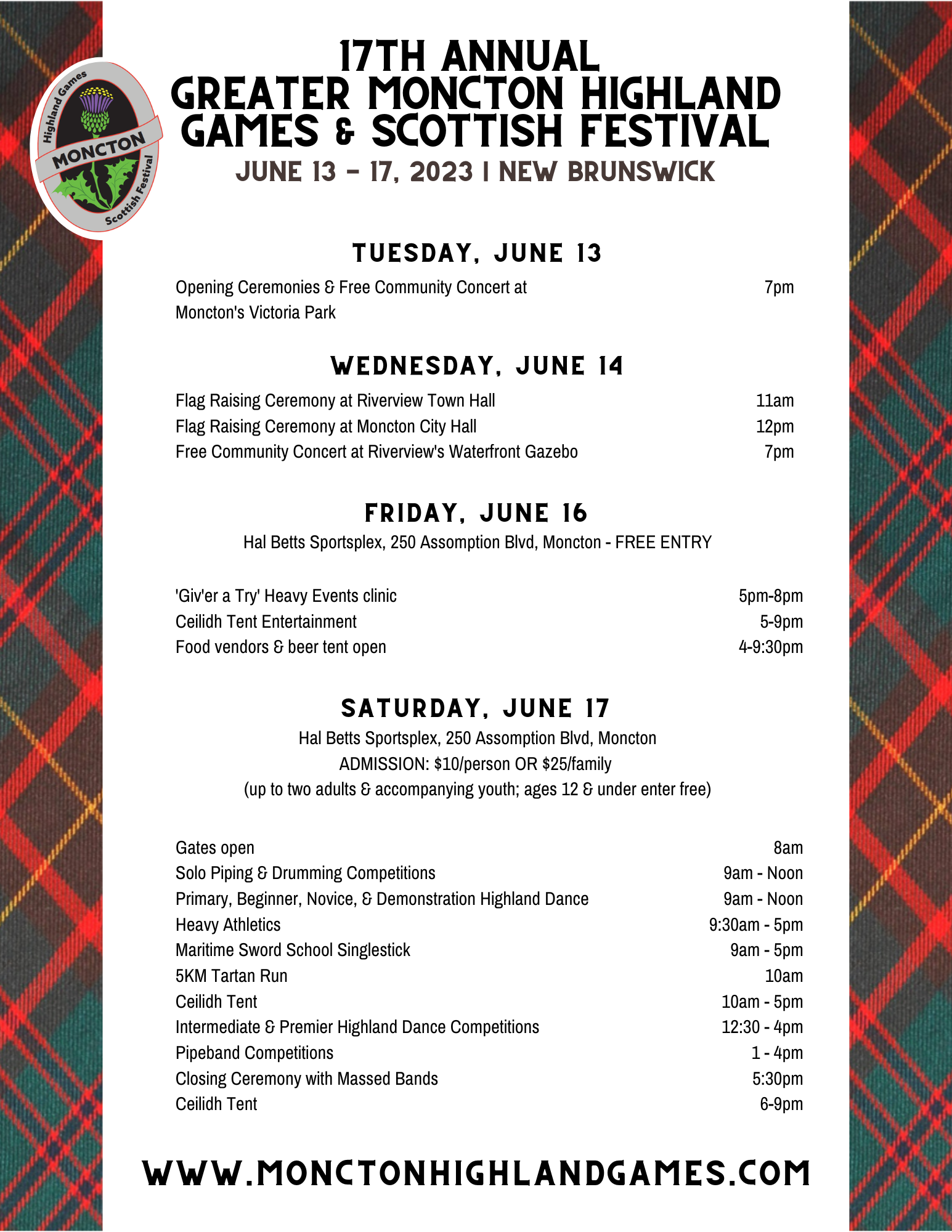 The 17th annual Greater Moncton Highland Games & Scottish Festival takes place June 13 – 17, 2023.