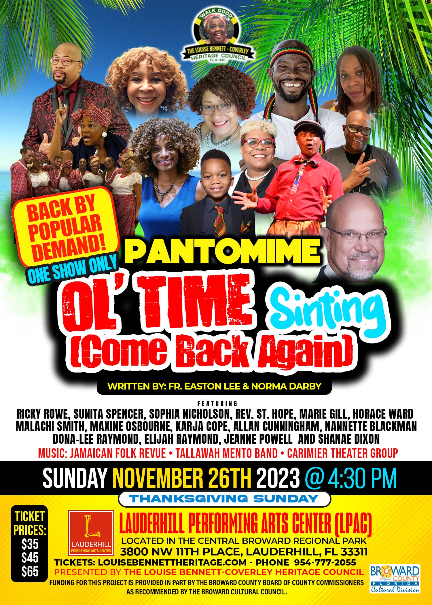Don’t Miss this delightful and entertaining family-friendly production that everyone is talking about. A real Jamaican Pantomime with nuff laughing, singing and dancing. “Ol’ Time Sinting Come Back Again” features a cast of talented actors including Ricky Rowe, Marie Gill, Rev. St. Hope Titus, Sophia Nicholson, Jeanne Powell, Malachi Smith, Fr. Horace Ward, Sunita Spencer, Maxine Osbourne and other well-known local personalities. Musical accompaniment by the Jamaican Folk Revue, Carimier Theater Group and the Tallawah Mento Band.