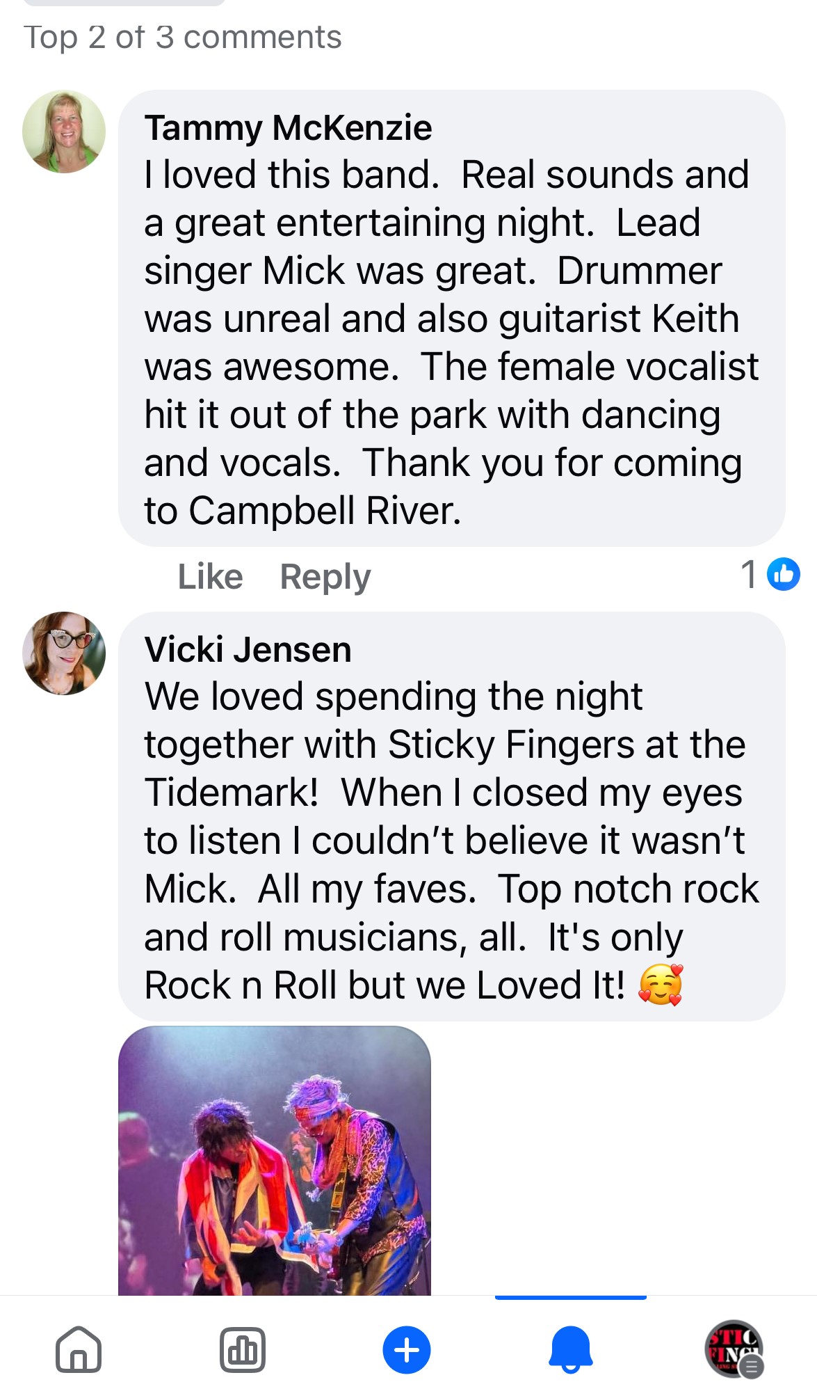 “This band did not disappoint. Sticky Fingers drew a surprisingly large and happy crowd. Great performance, presentation and showmanship. Very faithful to the Stones' discography. Everyone had a fun night”.