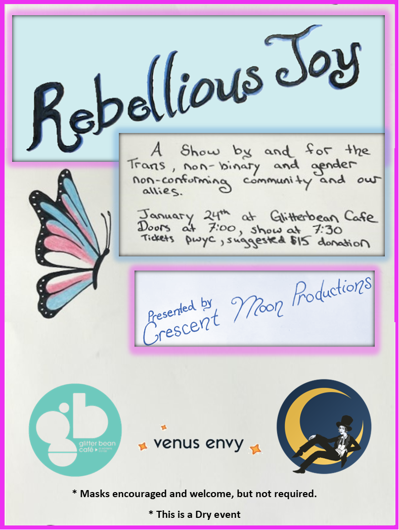 Rebellious Joy: A show by and for the Trans, Non-Binary and other gender non-conforming spectrum communities and our allies! Rebellious Joy is a safe space for visible joy, a celebration of who we are, a way to come together. Come feel a little less alone on January 24th at at Glitterbean Cafe Doors at 7:00, show at 7:30.