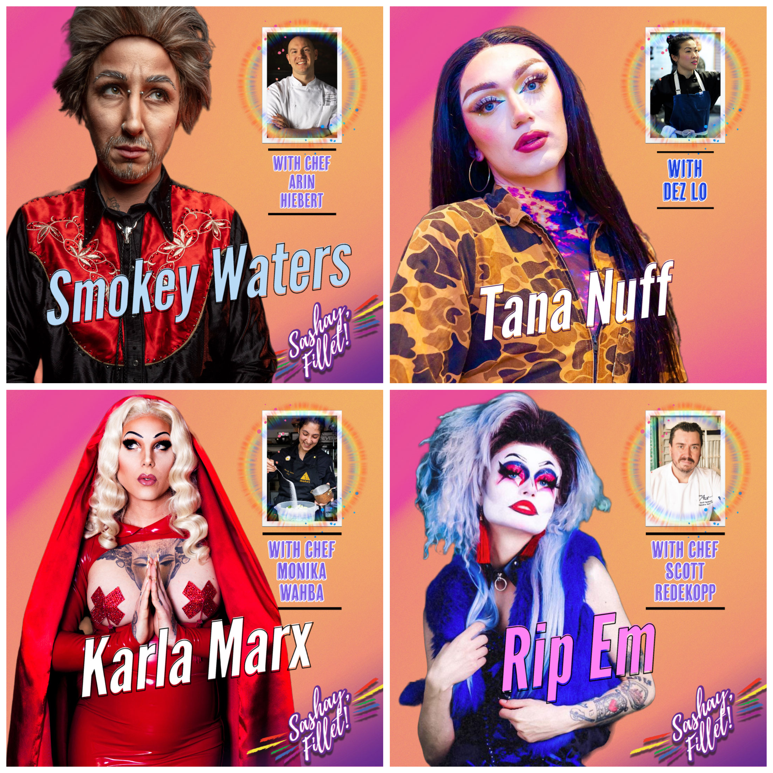 The pairs will be judged by a panel of local personalities who will eliminate the teams one-by-one until a winning Sashay, Fillet! pair is crowned at the end of the night!