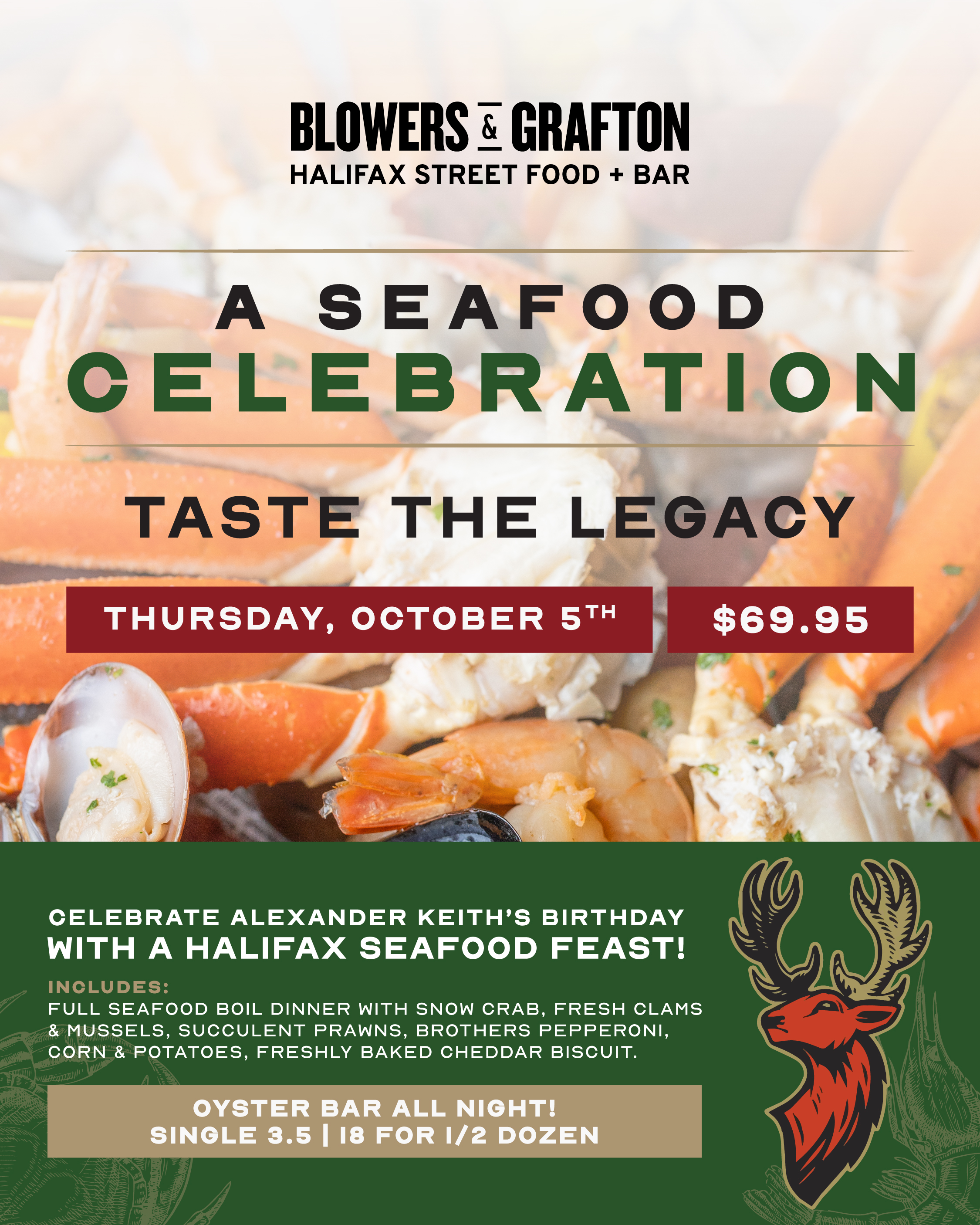 Come celebrate the birthday of Halifax legend, Alexander Keith at Blowers & Grafton, featuring a full seafood boil that includes; snow crab, clams, mussels, shrimp, Brothers Pepperoni, corn, potatoes & freshly baked cheddar biscuits.