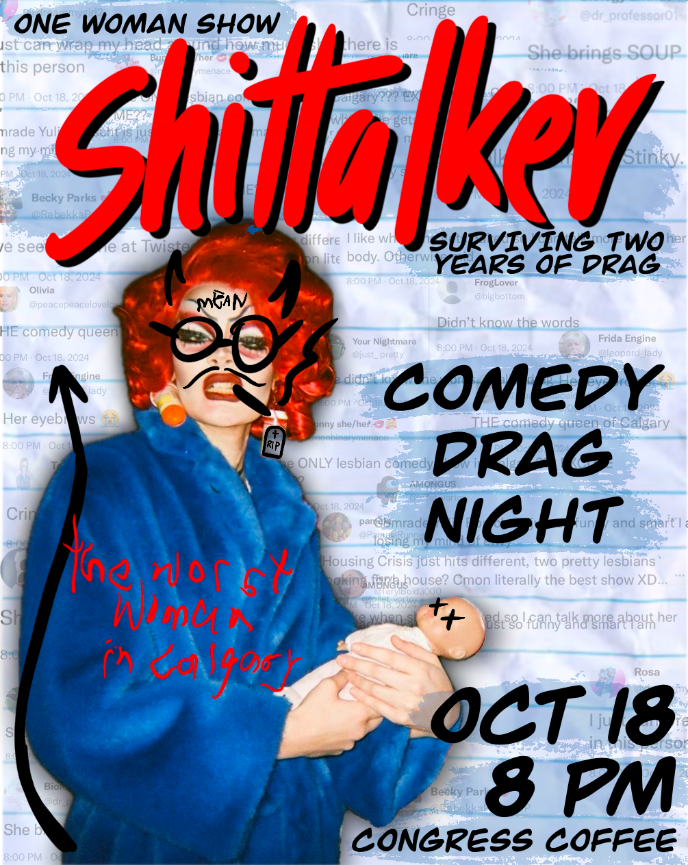 Confessions, drama, accusations, comedy, poetry, magic, apologies, lies, denial, delusions, 70s-inspired choreographed dance routine, live singing, attention-seeking behaviour — half of that, or more, in “Shittalker”: an anniversary show celebrating THE comedy queen of Calgary, Comrade Yulia Borscht.