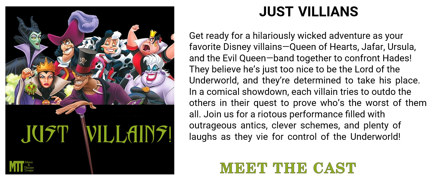 Join us for a delightful two-part performance featuring our talented young stars! First, you'll meet some of your favorite Disney Villains as they hilariously try to take control of the Underworld.