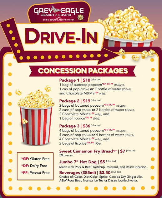 CONCESSION PACKAGES will be available for this event to pre-order on Drive In tickets ONLY (not available for Hotel Packages). Upon purchasing a Drive In ticket, you will receive an email confirmation of your order which will include the information and link for purchasing Concession items.