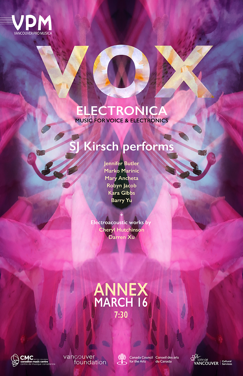 Vancouver Pro Musica is excited to present VOX ELECTRONICA - 6 NEW works for voice and electronics, performed by soprano, Sarah Jo Kirsch and 2 NEW fixed media electroacoustic works.
