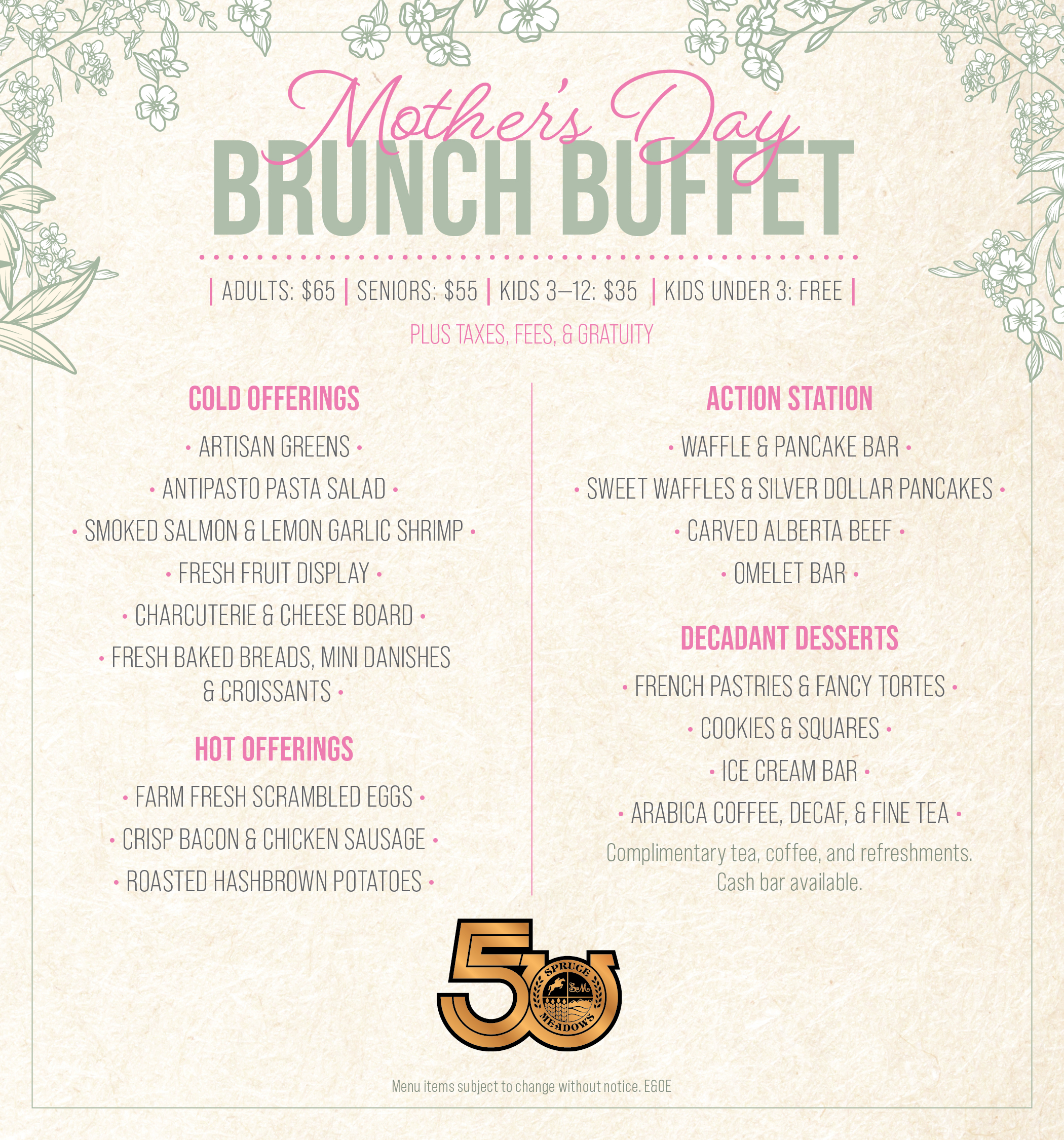 Enjoy a beautifully curated buffet featuring fresh cold offerings such as seasonal fruit, smoked salmon, lemon garlic shrimp, and charcuterie. Indulge in made-to-order selections from our Waffle, Pancake, and Omelet Bar, or savour the flavours of our carved Alberta beef station. Traditional breakfast favourites and a decadent dessert bar complete this exquisite dining experience.