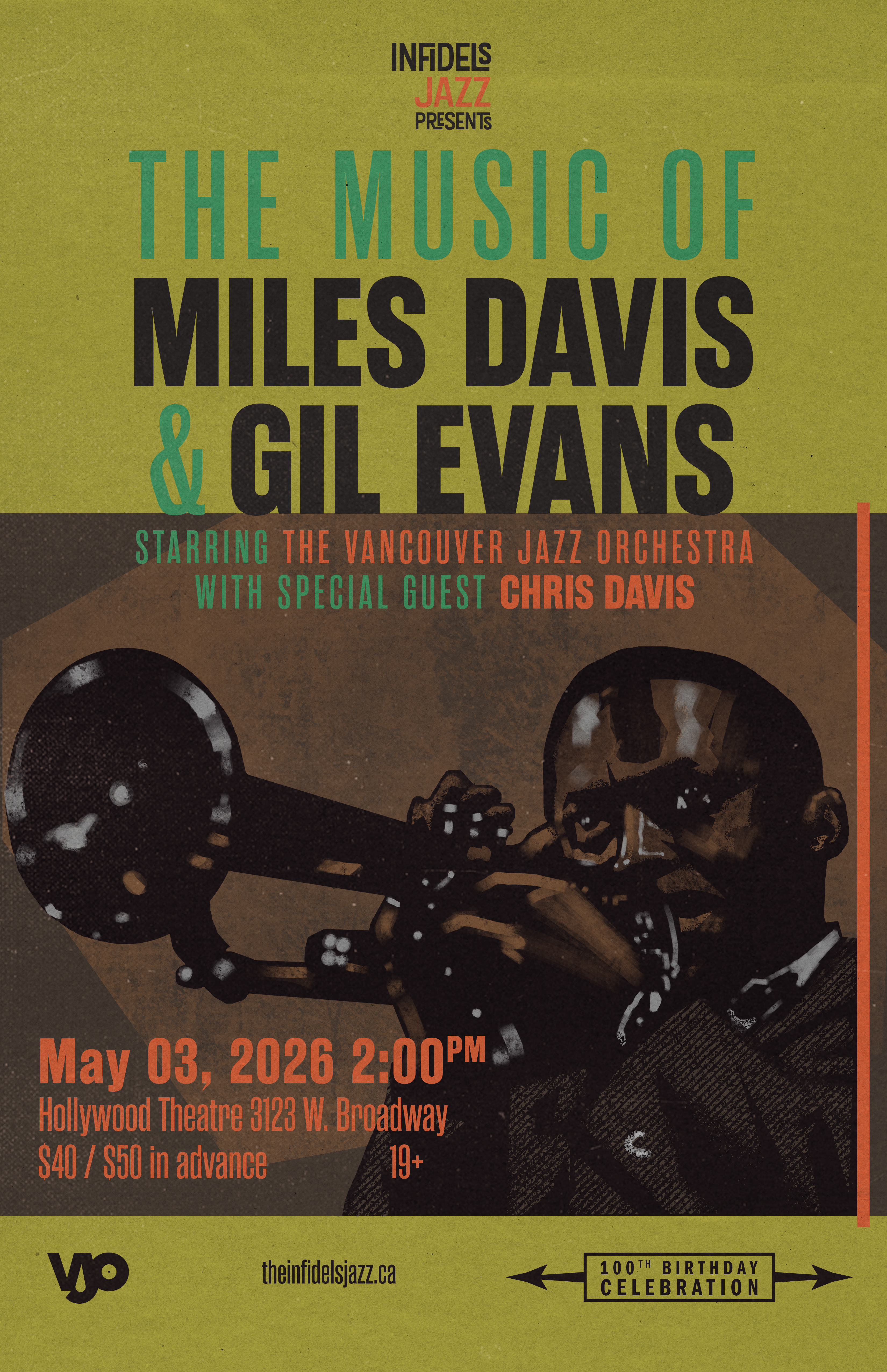 Vancouver is celebrating the 100th birthday of Jazz icon Miles Davis this May with a series of concerts covering every era of this musical trailblazer. On May 03, 2026, the Vancouver Jazz Orchestra, under the direction of James Danderfer, will be performing the music of Miles Davis's groundbreaking collaborations with Gil Evans, from landmark albums such as Sketches of Spain, Miles Ahead, and Porgy & Bess. Joining the VJO for this rare live performance of this music, will be trumpeter Chris Davis, known for his work with Sharon Jones & The Daptones, Steven Colbert's Late Show Band, and Lee Fields.