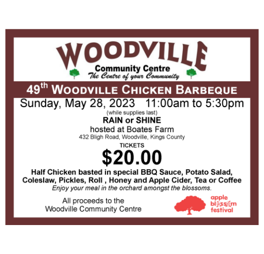 The Annual Woodville Chicken Barbeque is being held on Apple Blossom Sunday, May 28 2023 hosted at Boates Farm, 432 Bligh Road, Woodville, Kings County. The Half Chickens are barbequed over an open pit with our special BBQ Sauce and then served with Potato Salad, Coleslaw, Pickles, Roll, Honey and a glass of Boates Apple Cider. Picnic tables are spread through out the orchard and if the timing is right the Apple Blossoms are beautiful.