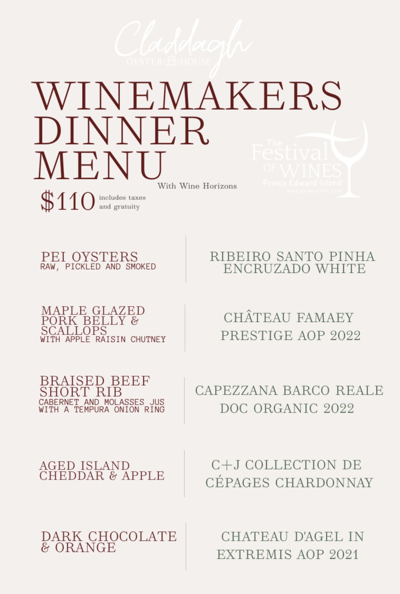 In partnership with Wine Horizons for the PEI Festival of Wines, we're hosting a Winemaker's Dinner featuring curated pairings designed to complement every course.